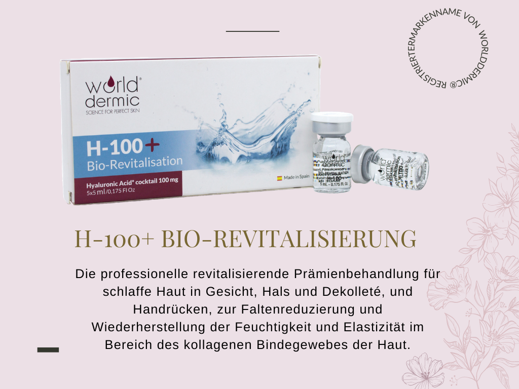 Das H100plus bildet den krönenden Abschluss der Behandlungsserie. Es ist DIE Antwort gegen das Altern der Haut, gegen Elastizitätsverlust, gegen Feuchtigkeitsverlust, gegen das ‚Absacken‘ der Haut, gegen ‚lebloses‘ Aussehen. Optimale Rehydrierung durch den hohen Anteil unvernetzter Hyaluronsäure. Brenztraubensäure erhöht die zelluläre Sauerstoffversorgung der Haut, beschleunigt die Zellenergie- und die Zellerneuerung, stimuliert Kollagen-, Elastin und Glycoproteinproduktion. Weitere hocheffektive Inhaltstoffe des Beautycocktails verstärken die Wirkung, um nachhaltig zu einem frischen, strahlenden und lebendigen Erscheinungsbild zu gelangen.